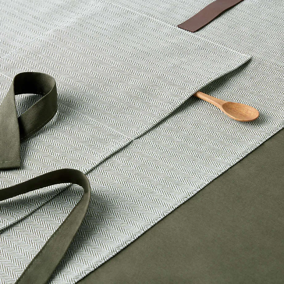 Protect your clothes as you cook or bake with this apron designed with classic Kitchen quality and style. Woven of pure cotton, the apron pairs solid forest green with a smart herringbone weave in evergreen and cream. Two pockets and a brown leather loop hold dish towels, recipe cards, a timer and more. Green adjustable faux leather straps with brass buckles provide a personalized fit and elevated finishing touch, making this apron the perfect accessory for hosting dinner parties and backyard barbecues.